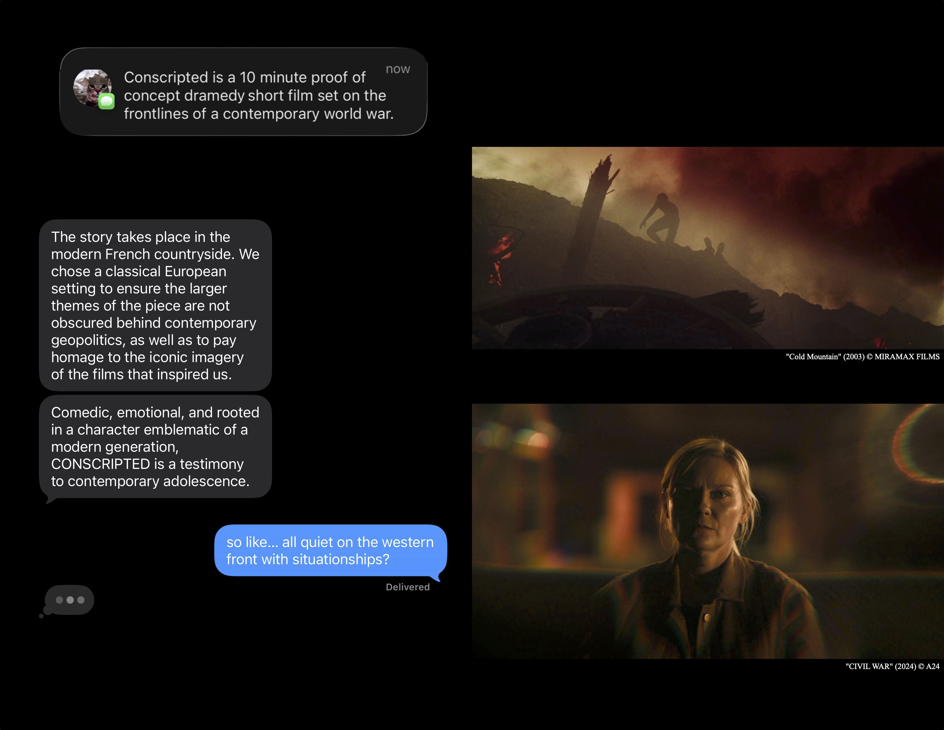 'Conscripted' is a drama/comedy short film set on the frontlines of a contemporary world war and follows Gil Thompson, a young high school graduate and newly conscripted soldier, who faces the brutality of war equipped with nothing but talk therapy, a Xanax, and breathing exercises to keep him sane. Using warfare as a metaphor for the experience of growing up as a young person in today's world, the film examines the unprecedented lack of control and the desperation many people feel today when seeking a lifeline.